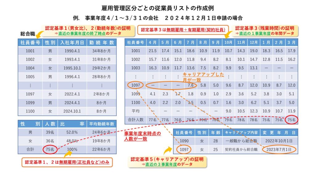 「社員番号(個人を識別できるもの)」、「性別」、「入社年月日」、「勤続年数」(.女性労働者のキャリアップの対象者は年齢等を記載する場合も有り)を記載したリストと、直近の事業年度1年間の各月ごとの残業時間を記載したリストを作成します。