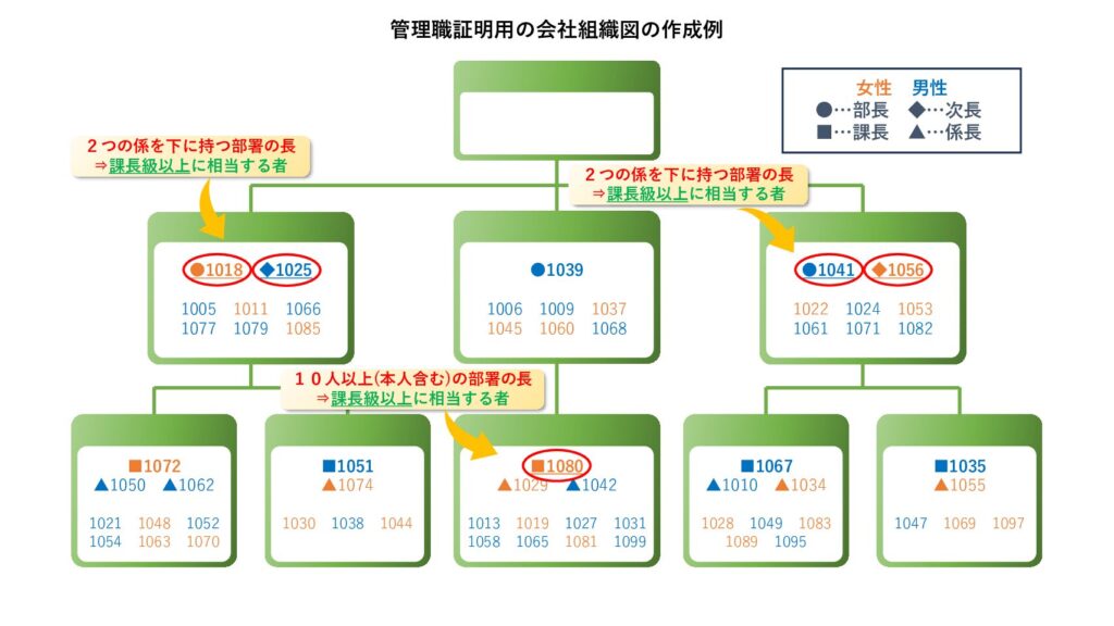認定基準「.管理職に占める女性労働者の割合」の証明については、下記のような組織体系の表を作成するとよいでしょう。